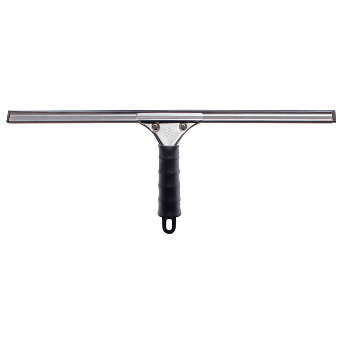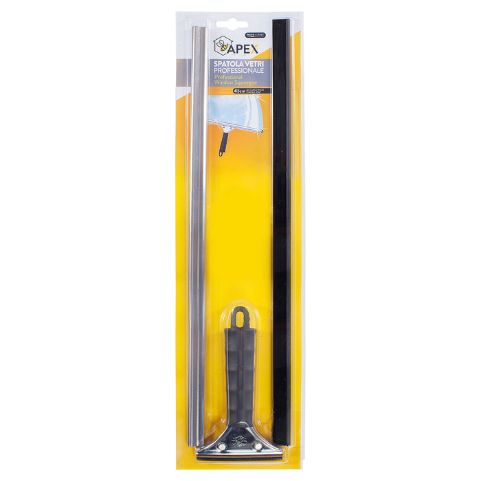 Spatola vetri professionale con solida struttura in metallo e sistema aggancio-sgancio rapido della gomma in acciaio inox. Morbida impugnatura in gomma. Gomma utilizzabile su entrambi i lati e facilmente sostituibile.